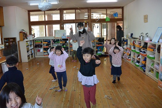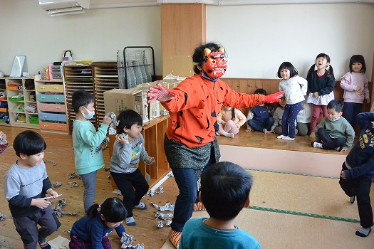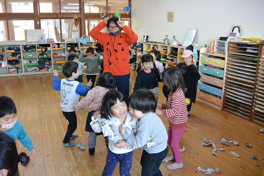 2023年02月08日 鬼ごっこ(追いかけっこではないよ) 3歳児 つき 節分が終わりました しかし、まだ節分ごっこならびに鬼ごっこしてみよう 「まずは、おとなが鬼になりきってするから、次はこどもの番だからね」と話し合って、スタート 土屋鬼は、みんな大笑い じゃ~このつぎは・・・ こどもたちが鬼になって登場だ! 一覧へ戻る