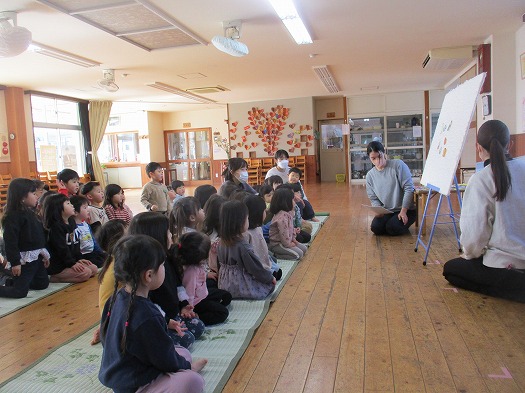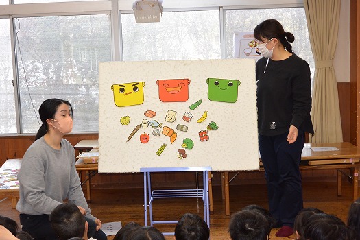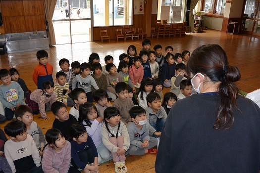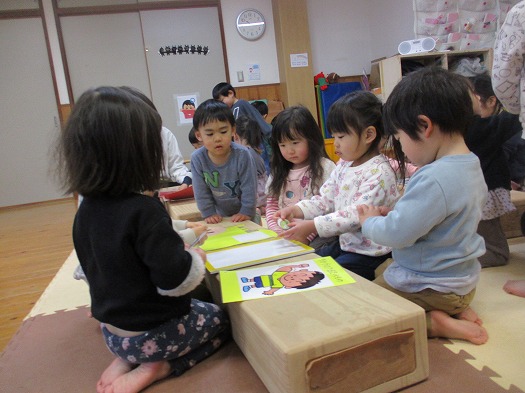 2023年02月21日 き・あか・みどりで元気なからだキャラバン くじら(事務室) 黄色の鍋は「力のでる食べ物」、赤色の鍋は「身体を作る食べ物」、緑色の鍋は「身体の調子を整えて、病気になりにくくなる食べ物」で出ている食材が何色の鍋かこどもたちに聞きながらキャラバンをしました。「バナナは黄色いから黄色の鍋かな?」や「緑の鍋は多いな」という声が聞こえました。 ほし組・そら組がキャラバンを聞いている様子です。 にじ組・つき組がキャラバンを聞いている様子です。 キャラバン後、き・あか・みどりの食べ物列車の貼り付けあそびをしました。にじ~そら組の部屋にあります。ぜひあそんでいる様子をみてください。 一覧へ戻る