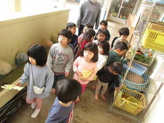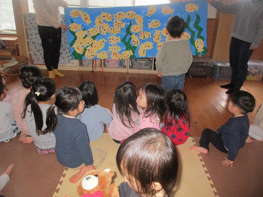 2023年03月02日 さかな探し 2歳児 にじ さかな探しをしました。 先日、こどもたちが作った魚が海から逃げた!ということで「どこかな?」「こっちにあるかも」などと友だちと話ながら廊下やテラスを探していました。 見つかると「あった」と嬉しそうな表情で友だちや保育者に見せ、無事に全部のさかなを海に泳がすことができました。あ~よかったね。 一覧へ戻る