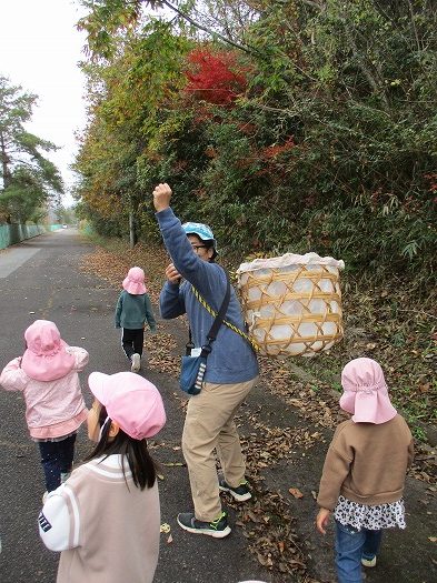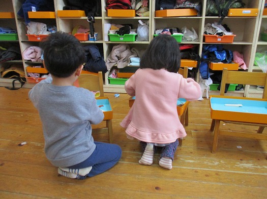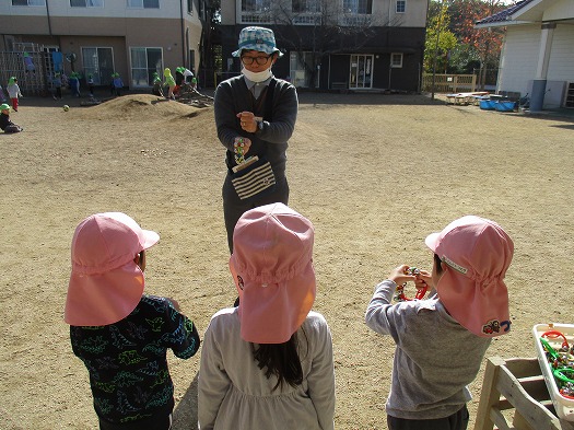 発表会の取り組みのとき、気分を変えて外で鈴を使う活動をしました