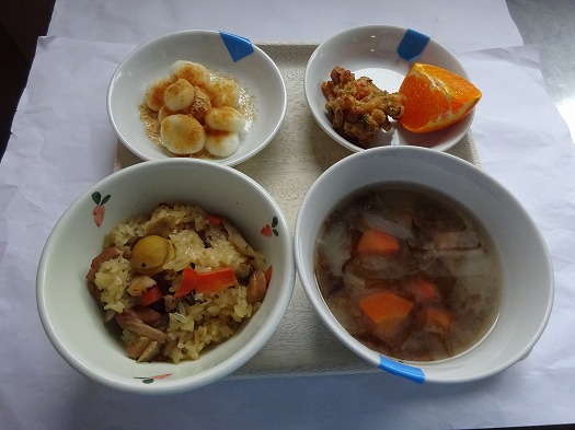 2023年03月22日 給食室(3月16日の給食、おやつ) 給食室 昼食 ・蒜山おこわ(岡山) ・納豆の天ぷら ・のりのみそ汁 ・果物(せとか) おやつ ・きな粉もち 『納豆の天ぷら』は、 納豆、しらす、にら、玉ねぎを小麦粉、卵、醬油と混ぜて、 油で揚げることで、食べやすく、 かみかみメニューになっています。 おやつの『きな粉もち』は、 そら組さんのリクエストで、 こどもたちに人気です。 一覧へ戻る