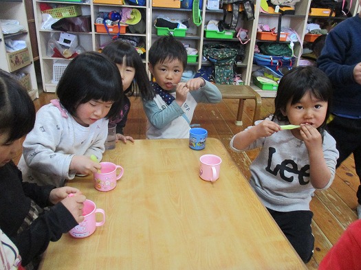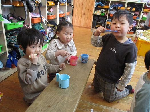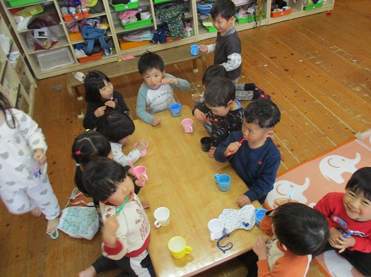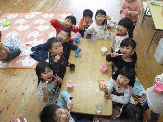2023年03月10日 歯磨きスタート 3歳児 つき 3月6日から歯磨きがスタート こどもたちにとっては待ちに待った歯磨き 「上の歯、下の歯、前歯、奥歯~♬♪」の歌声に合わせて、丁寧にみがいていきます 一覧へ戻る
