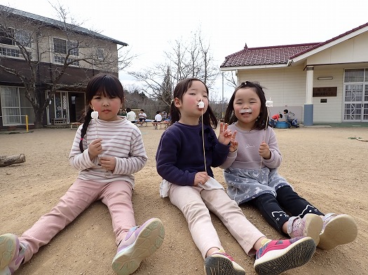 2023年03月29日 美味しいね 4歳児 ほし 焼きマシュマロをしました。 初めて焼きマシュマロをする子もおり最初はなかなか焼けず苦戦していましたが根気強くマシュマロを焼いていました。 できあがったマシュマロを食べると「とろけるね」「甘くておいしいね」などと嬉しそうに食べていました。 一覧へ戻る