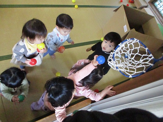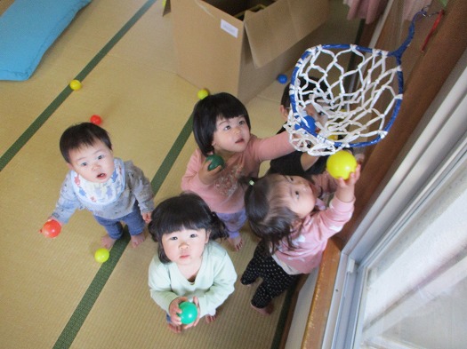 背伸びしてなんとかボールをゴールに入れようとしたり、
