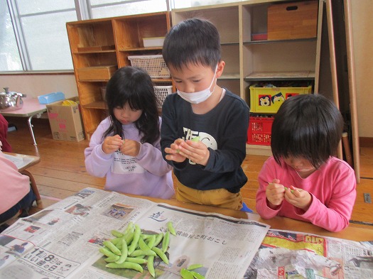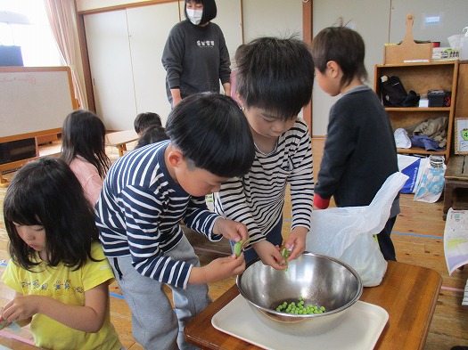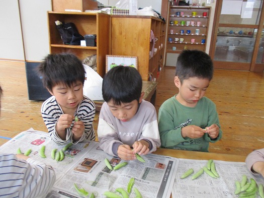 2023年04月26日 皮むきしたよ 5歳児 そら グリンピースの皮むきをしました。 保育者がグリンピースを持ってくると、「やりたい、やりたい」という言葉がいろいろなところから聞こえてきました。 やり方を見た後は、みんな真剣に皮むきを始めます。 中から豆が出てくると、「みて」と友だちや保育者に見せるこどもたちです。 給食に出るのが楽しみですね。 一覧へ戻る