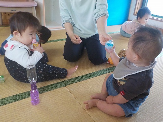 2023年05月12日 きれいだね。 0歳児 はな 新しい手作りおもちゃがはなぐみにやってきました。 容器の中で移動する色がとても綺麗で、じーっと見つめるこども達。 振ると感触も楽しいので、夢中で遊んでいます。 実は、これは、職員たちもいつまでも見ていられます… 一覧へ戻る