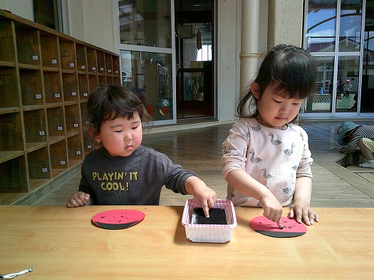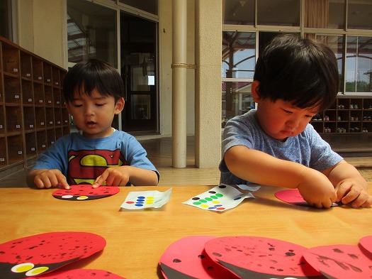 2023年05月18日 てんとう虫 2歳児 にじ てんとう虫を作りました。 指スタンプで羽根に模様を付けました。 指に付いた絵具の色をじっと見つめたり、トントントンと連続でスタンプして色が薄くなっていく様子を見たりなど、こどもたちの様子はそれぞれでしたが、みんな嫌がらずにスタンプできました。 最後に目玉。白いシールを貼ってから、その上をねらって重ね貼りをしました。 重ね貼りは、小さな範囲の中なので、思うところに貼りにくかったようですが、みんな貼り終わると「出来た!」と満足そうにしていました。 部屋に飾っているので、また見てくださいね。 一覧へ戻る