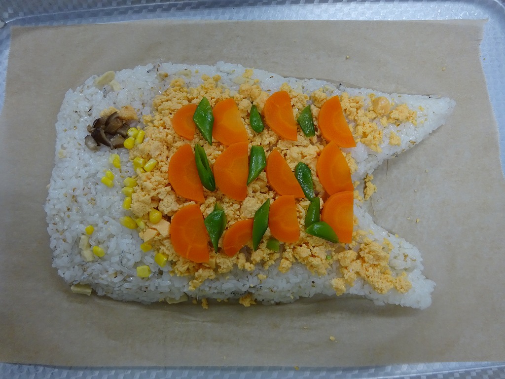 ・こいのぼりちらし寿司・・・「こいのぼりだ~」と喜んで食べていました。うろこに見えるように人参とスナップえんどうで飾り付けをしました。目は炊いたしいたけです。