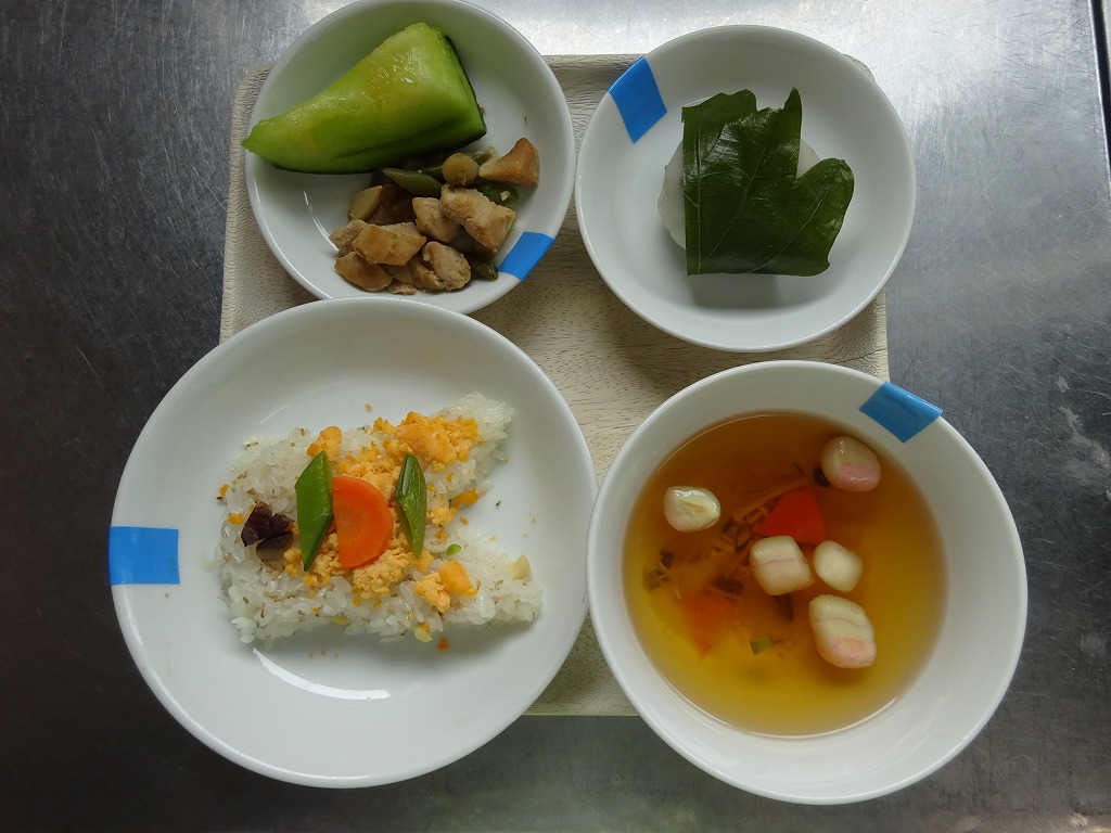 ・かしわもち・・・初めて食べるこどももいたようで楽しみにしていました。 柏の葉のいい香りがしました。 歯ごたえのある食感でよく噛んで食べていました。柏餅について今月のぱっくんにも載せているのでまだ見てない方は、是非確認してみてくださいね。