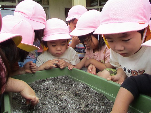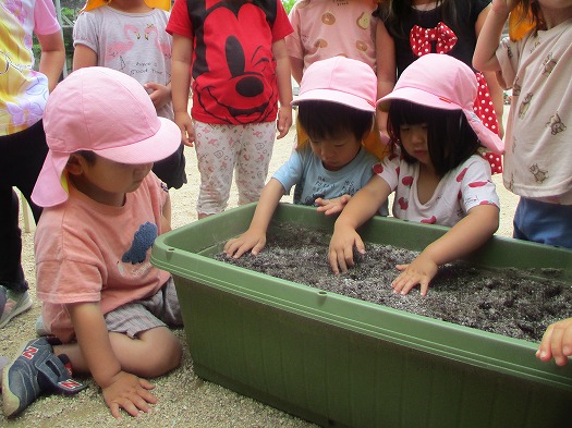 2023年05月26日 野菜の種を植えよう 3歳児 つき 今日はモロヘイヤの種を植えました。 「これなに?」「はっぱ?」などとモロヘイヤの写真を見て言うこどもたち。 指で穴をあけ、そーっと種を入れやさしく土をかけると「おおきくなってね」とみんなで言いながら水をあげました。 芽が出るのが楽しみだね。 一覧へ戻る