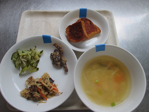 2023年06月01日 給食室(5月29日の給食、おやつ) 給食室 昼食 ・ごはん ・クーブイリチー ・レバーかりんとう ・きゅうりの酢の物 ・えのきのみそ汁 おやつ ・シナモントースト ・牛乳 『クーブイリチー』のクーブは昆布、イリチーは炒め物という意味で 沖縄の郷土料理だそうです。 豚肉、昆布、にんじん、しらたき、切り干し大根と たくさんの食材を使用しています。 おやつは『シナモントースト』でした。 一覧へ戻る