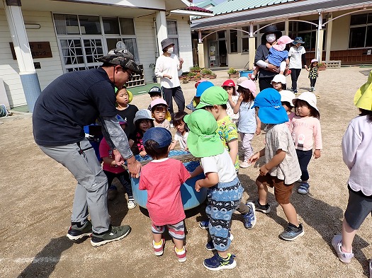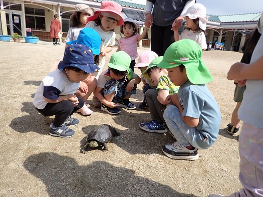 のんびり歩いて行くカメを、見守りながらカメに合わせて一緒に移動するこどもたちでした。