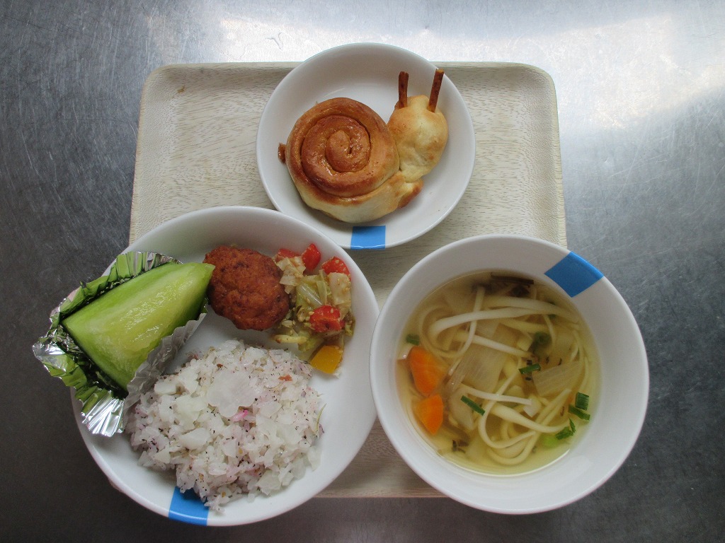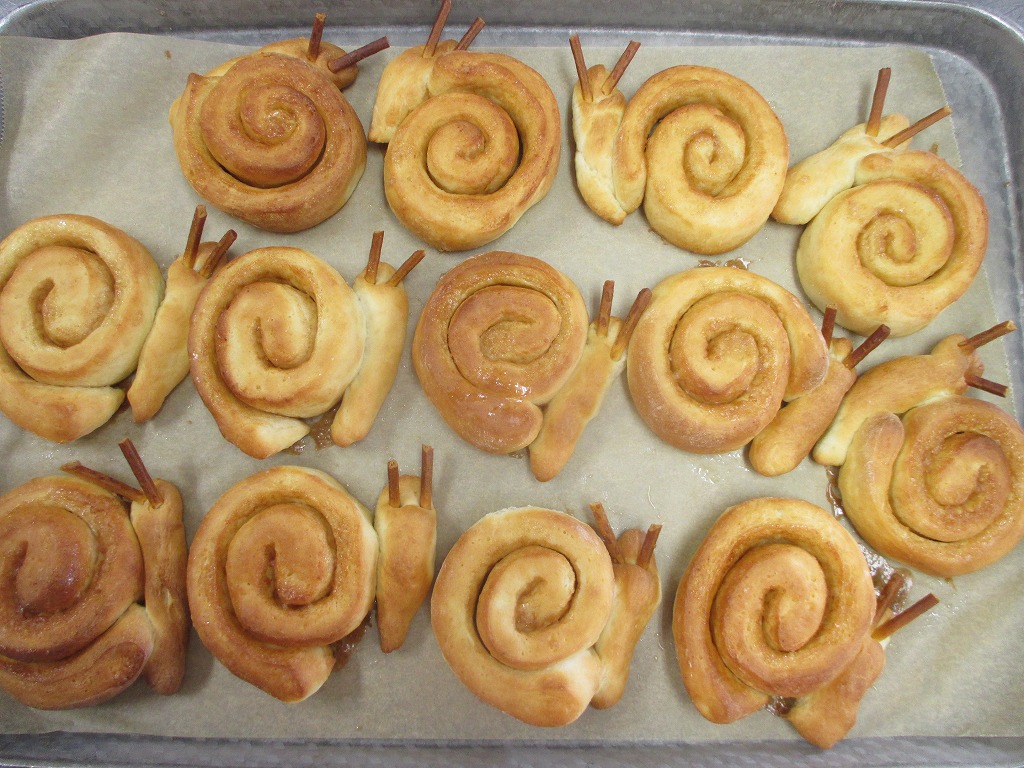 ・かたつむりパン・・・プリッツの角をつけています。パンはシナモンロールです。かたつむりに見えますか?こどもたちは喜んで食べていました。