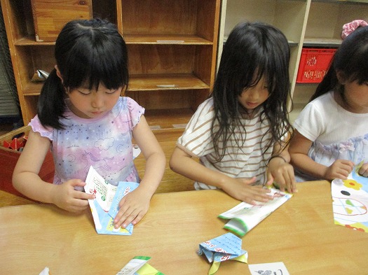 2023年06月16日 何折ろうかな 5歳児 そら 折り紙をしました。 最近折った、カエルを折ったり、紙飛行機を折ったり。 難しいところは近くの友だちに聞いて、やり方を教えてもらっていました。 ハートをたくさん折って、四葉のクローバーにする子もおり、発想力豊かですね。 一覧へ戻る
