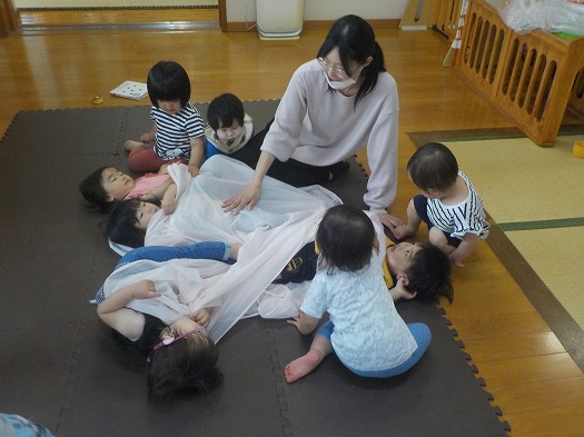 2023年06月16日 布あそび 0歳児 はな 1歳児 ゆき 布あそびをしました。 保育者が「おやすみ」と言うとこどもたちは寝転がり布を布団のように見立ててお昼寝をしていました。 友だちにトントンをする姿もみられました。 一覧へ戻る