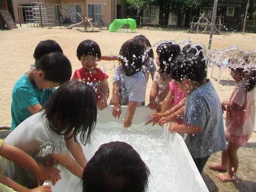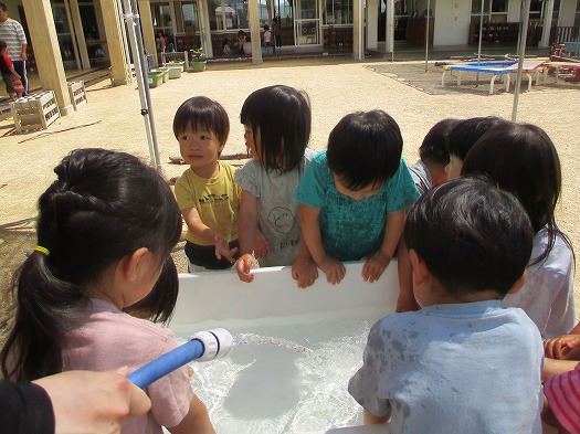2023年06月16日 水あそび 3歳児 つき 水あそびをしました。 こどもたちは水あそびとどろんこができるようになってからすごく楽しみにしていたので、朝の集まりで「今日は水あそびをするよ」と伝えると「やったー」と喜んでいました。 「きゃー」「つめたい」と言いながら水に触れ、ストローでは水を吹いたり、スポンジでは水をすいとったりして楽しみました。 これからもどろんこや水あそびをこどもたちと一緒に楽しみたいと思います。 一覧へ戻る