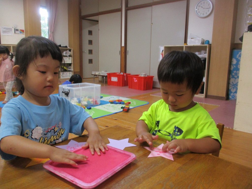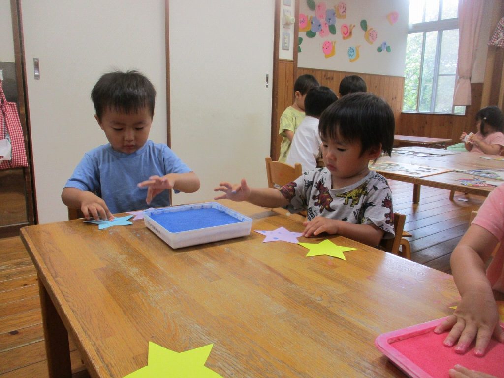 2023年06月21日 お~ほしさ~ま☆き~らきら♪ 2歳児 にじ 星型に切った画用紙に、指スタンプで色を付けました。 星の色と、スタンプの色は自分で選んでいます。 七夕の飾りになる予定です☆ 一覧へ戻る