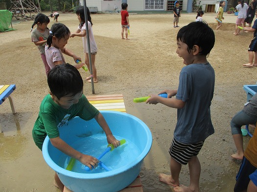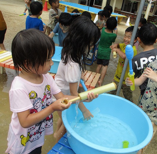 2023年07月07日 遠くまで 5歳児 そら 水鉄砲をしました。 水が遠くまでびゅーんと飛ぶと「すごい」「飛んだ」と嬉しそうに保育者や友だちに伝えていました。 繰り返し水を入れたり、飛ばしたりを楽しんでいました。 友だちとかけあう姿も見られ、楽しそうな声が響きました。 一覧へ戻る