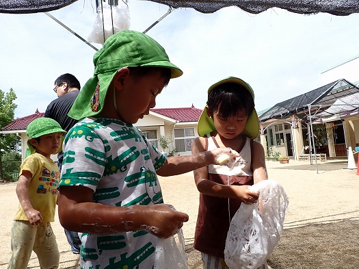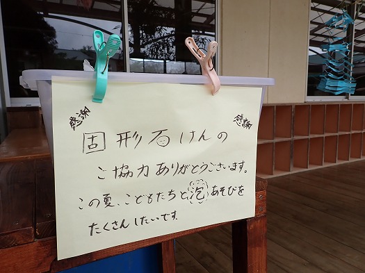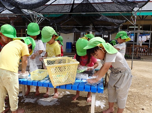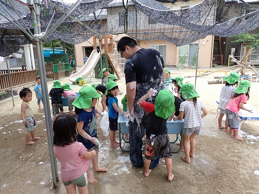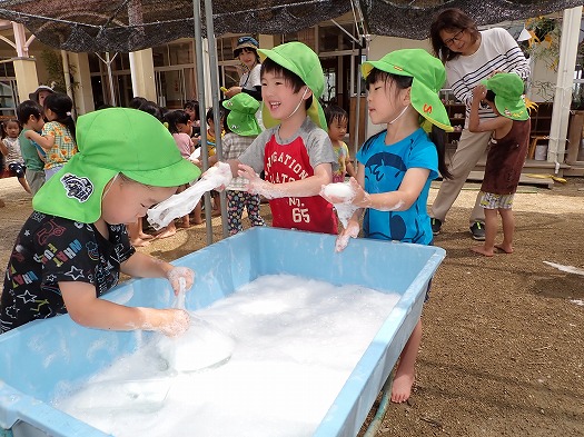 2023年06月28日 泡まみれはおとな?こども? 4歳児 ほし みなさんからいただいた固形石けんをさっそく使って泡あそびをしました 大根おろしをするように、固形せっけんをすりすりとしていくうちに水があわあわに変身 瀬戸さんの背中も泡まみれ 次は、洗顔ネットを買ってもっともっと泡をつくってみよーっと 一覧へ戻る