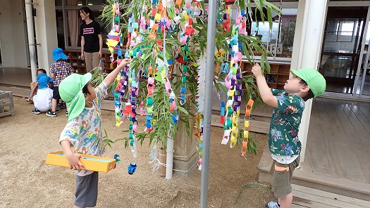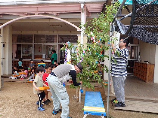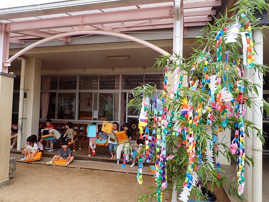 2023年07月05日 No.1のボリューム感 4歳児 ほし 先日しました老人会の方々が来て笹を取り付けてくれました 背の高い部分は、瀬戸さんにおまかせしよう! 飾りつけの日までたくさん作った飾りをお道具箱の箱を入れ物代わりにしていました お道具箱の箱を入れ物代わりにすることはなんどもしていたので、こどもたちから「お道具箱にしたらいいよ」と言っている子もいました 7月7日はどんな願いことを夜空にお願いしますか 一覧へ戻る