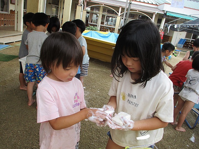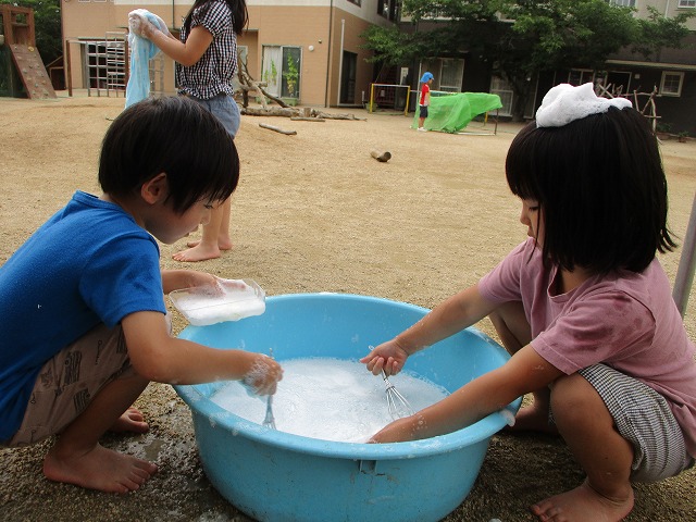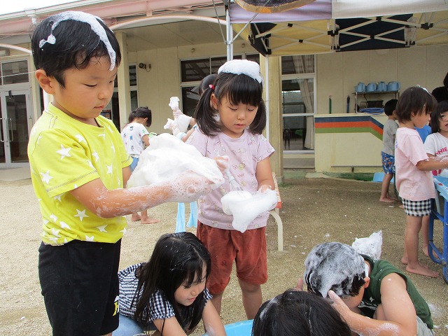 2023年07月13日 泡あそび 5歳児 そら 泡あそびをしました。 石鹸を手や泡だて器などで泡立てます。 頭につけたり、服につけたり。友だち同士でつけ合いっ子したり。 たくさん泡立つと袋にためる子もいました。 一覧へ戻る