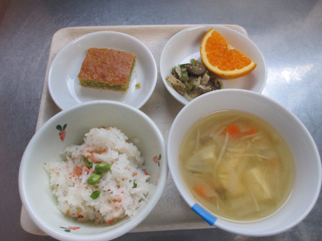 2023年08月10日 給食室(7月13日の給食、おやつ) 給食室 昼食 ・枝豆ごはん ・キャベツとなすのもみ漬け ・具だくさんのみそ汁 ・果物 おやつ ・ゴーヤケーキ ・牛乳 『枝豆ごはん』は、 旬の枝豆と焼いたたらこをほぐして混ぜています。 よく食べていました。 おやつの『ゴーヤケーキ』も 旬の食材、ゴーヤをミキサーでみじん切りにして、使用しています。 シナモンで少し臭みを消しています。 一覧へ戻る