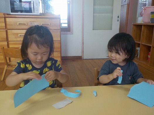 青い色紙を渡すと「あおー」と指をさして何をするのか楽しみな様子でした。