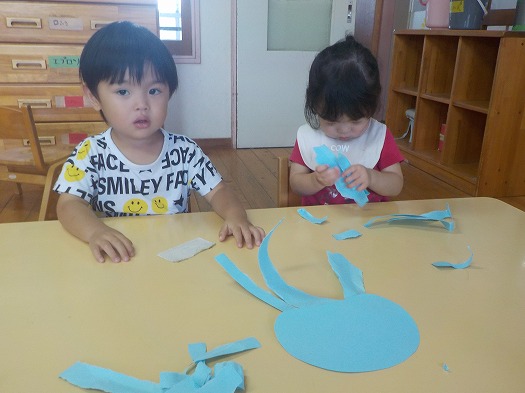 ちぎった紙をくらげの頭に付けて「これくらげだよ」と伝えてみましたが、こどもたちは「・・・?」