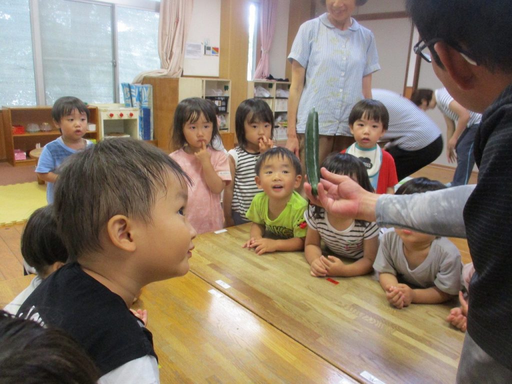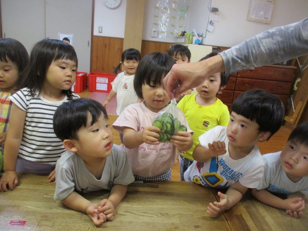 花が咲き、小さなキュウリの実がつくと「キュウリの赤ちゃんできとる!」と言っていた子もいました。