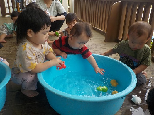 2023年07月20日 水あそび 0歳児 はな 1歳児 ゆき テラスにたらいを出して金魚の玩具を入れて水遊びをしました。 はな組ゆき組一緒に水遊びをするのは初めてでした。 ゆき組のこどもが水鉄砲の容器に水を入れ、穴から水を出す様子をはな組に見せていました。 穴から出てくる水を見てはな組のこどもがにっこり笑っていました。 ほっこりした場面を見ることができてとても嬉しかったです。 一覧へ戻る
