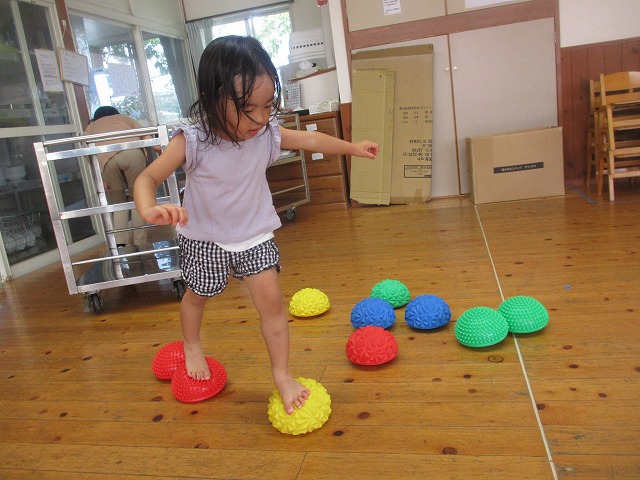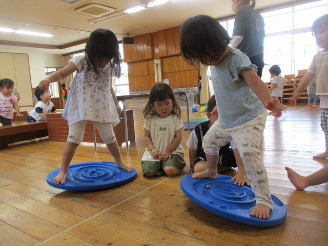 2023年07月19日 感覚あそび 2歳児 にじ ホールで感覚あそびをしました。 自分でバランス取れるかな? 足裏を刺激しながらのバランスも。 みんなで入ると楽しさ倍増! 自分で自分の身体のバランスを取りながら、身体をコントロールする。難しいけれど、面白かったようでした。 一覧へ戻る