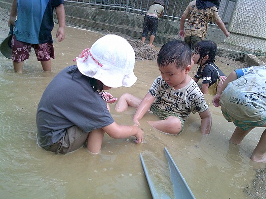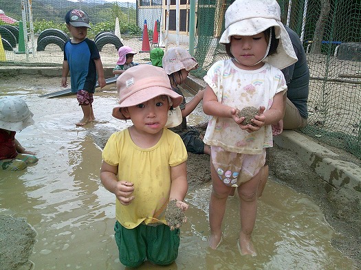 どろ団子を作ったり、帽子をバケツ代わりにして職員が掘った穴に水を運んだりして楽しみました♪