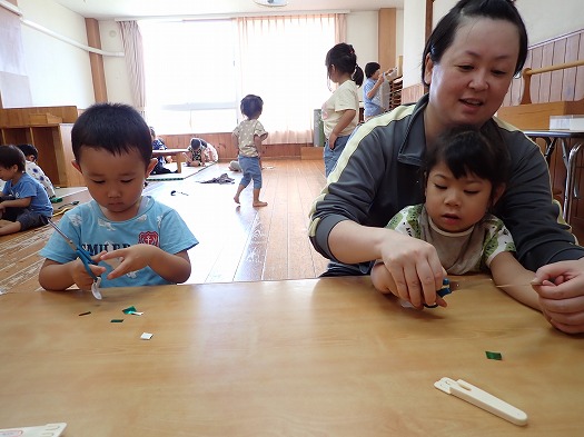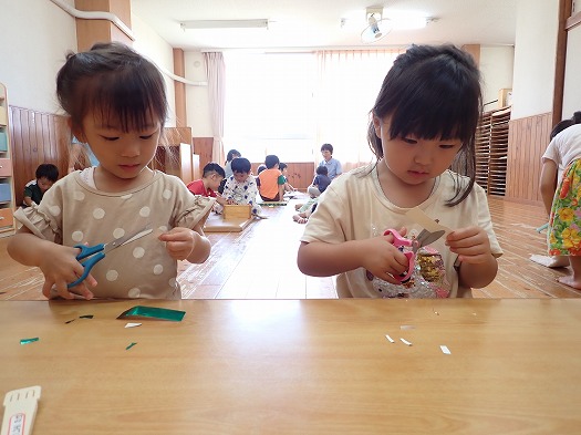 2023年08月10日 はさみ 3歳児 つき ハサミをしました。 真剣な表情でハサミを使うこどもたち。 最初は持ち方や切り方に苦戦している姿もみられましたが、すぐにコツをつかみ、一枚切り終えると「まだする」と何枚も切っている姿がみられました。 一覧へ戻る