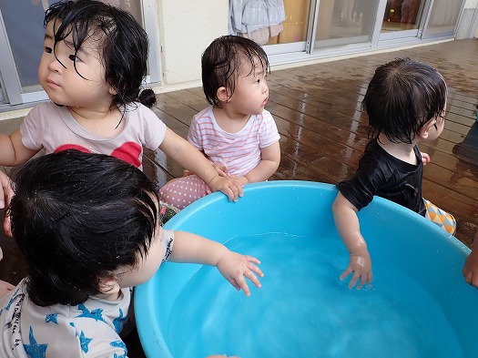 久しぶりの水遊びに、初めはそっと水を触っていましたが、少しづついつものようにダイナミックになり、あっという間にビショビショになっていました。