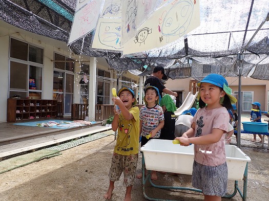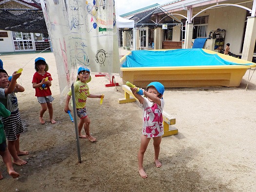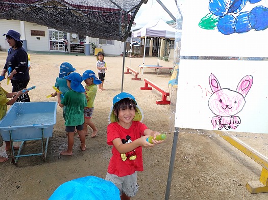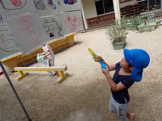 2023年09月05日 水鉄砲 5歳児 そら 自分たちで描いた的で水鉄砲をしました。 水が的に当たると「当たった」と嬉しそうに教えてくれるこどもたち。 「これ私の絵」と友だち同士で見せ合う姿も。 繰り返し楽しみました。 一覧へ戻る