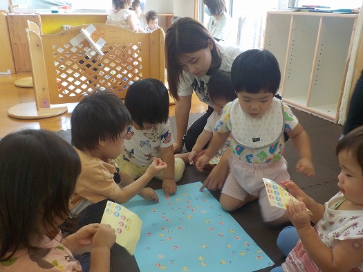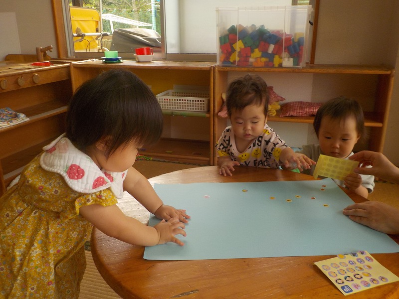 2023年09月07日 シール貼り楽しいなぁ 0歳児 はな 1歳児 ゆき 大きな画用紙に、シールをたくさん貼りました。 色んな柄のシールに大興奮のこどもたちでした! そら組がキャンプから帰ってきた時に飾って、おかえり言おうね。 一覧へ戻る