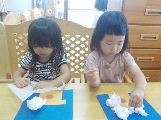 2023年09月11日 お月見 1歳児 ゆき 白い花紙をクシャクシャと手で丸めてお月見団子の製作をしました。 花紙を何個も丸めていくうちに、こどもたちは上手になっていきました。 一度台紙に貼った花紙を、貼ったり剥がしたりを繰り返し、楽しんでいる様子でした。 一覧へ戻る