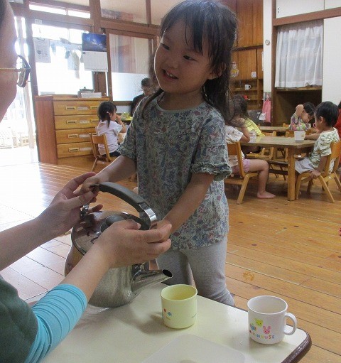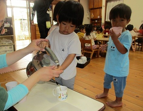 2023年09月19日 お茶を入れてみよう 2歳児 にじ 朝のおやつの時、自分でお茶を入れました。 と言っても、保育者が一緒にやかんを持っていたのですが、みんな両手で丁寧にやかんを持ち、慎重に入れていましたよ。 そーっと、そーっと。 自分でできるって嬉しいね♪ 一覧へ戻る