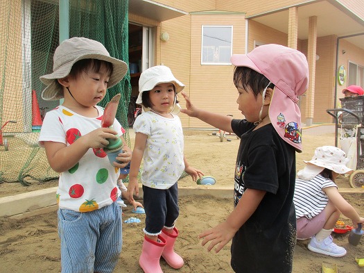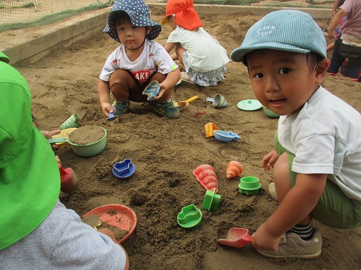 2023年09月26日 砂場であそぼう 2歳児 にじ ホールに集まって、砂場のおもちゃの使い方を確認しました。 久しぶりの砂場のおもちゃに大喜び。 スコップと型を手に砂場にいっぱい型を押していました。 「かして~」「いいよー」おもちゃの貸し借りをする姿もよく見るようになりました。 一覧へ戻る