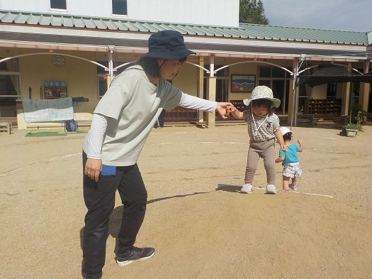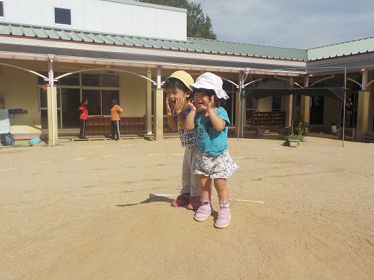 頂上に着いたこどもたちに保育者が「やっほ~!」と言うと