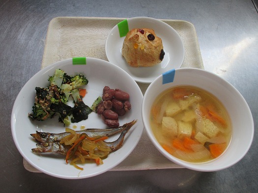 2023年10月12日 給食室(10月11日の給食、おやつ) 給食室 昼食 ・ごはん ・ししゃもの南蛮漬け ・金時豆の煮物 ・ブロッコリーのおかか和え ・油揚げのみそ汁 おやつ ・全粒粉パン ・牛乳 『ししゃもの南蛮漬け』は、 今日のかみかみメニューです。 いつものししゃもの素焼きに甘酢をかけています。 野菜といっしょにさっぱりいただけます。 おやつの『全粒粉パン』には、 今日、ドライフルーツが入っていました。 一覧へ戻る