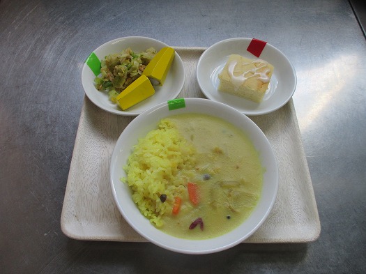 2023年10月17日 給食室(10月12日の給食、おやつ) 給食室 昼食 ・秋の実りホワイトカレー ・ツナサラダ ・バナナ おやつ ・豆腐レモンパンケーキ ・牛乳 『秋の実りホワイトカレー』の秋の実りには、 さつまいも、しめじ、エリンギが入っていました。 シチューのルーにカレー粉を入れて味をつけています。 よく食べました。 一覧へ戻る