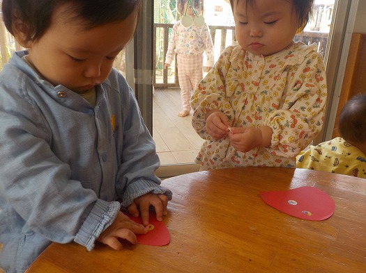2023年10月18日 どんなきのこができるかな? 0歳児 はな 10月の製作をしました。 指先が器用になってきて、でシールを貼るのがとても上手です!! みんな夢中でシールを貼っています。 どんなきのこができるか楽しみだね! 一覧へ戻る