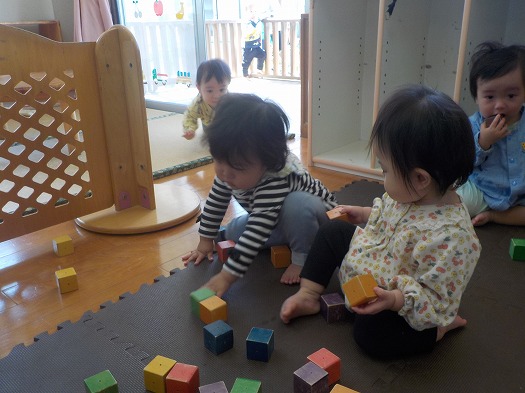 おもちゃを振ったり、自分で積み上げたり、倒したりて 遊んでいます !