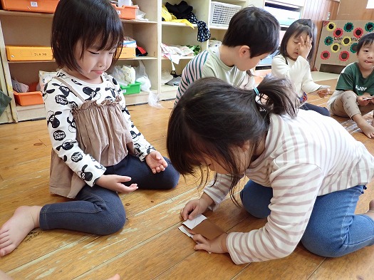 2023年10月13日 折り紙 3歳児 つき 折り紙でどんぐりを折りました。 折り方を伝えると、見本を見ながら真剣な表情で折るこどもたち。 困った子は自分から「てつだって」と声を掛け、早く折れた子が「こうだよ」と折り方を伝えるなど、助け合っている姿がみられました。 クレヨンで顔も描き、一人ひとり違ったかわいいどんぐりが完成しました。 一覧へ戻る