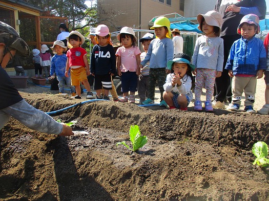 2023年10月18日 白菜、大きくなあれ! 2歳児 にじ 白菜の苗を、畑に植えました。 白菜の苗を見せて、「これなーんだ?」とクイズをすると「はっぱ!」「キャベツ!」「草!」と…。 「はくさいだよ」と伝えると、「……?」 見たことのある白菜とは違う姿で、わかりにくかったようで、まだ小さな白菜の葉っぱを、不思議そうに見ていました。 水やりしながら、白菜になっていく様子を、みんなで見守りたいです。 一覧へ戻る