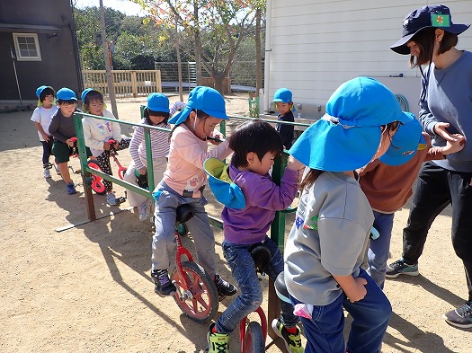 保育者が「一輪車出すよ~」と伝えると、大喜びのこどもたち。