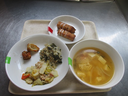 2023年11月15日 給食室(11月6日の給食、おやつ) 給食室 昼食 ・ごはん ・豚肉と白菜のみそ煮 ・ちくわの磯辺焼き ・わかめの酢の物 ・豆腐のみそ汁 おやつ ・もっちり大豆バー ・牛乳 今日は、『豚肉と白菜のみそ煮』、 『豆腐のみそ汁』で、 みそを使うメニューがかさなってしまいました。 おやつは新メニューで『もっちり大豆バー』でした。 ゆでた大豆をすりつぶして、 バター、たまご、小麦粉、砂糖、レーズンなどと混ぜ合わせ、 棒状にして、焼いたものです。 上には、牛乳のアイシングがかかっています。 一覧へ戻る