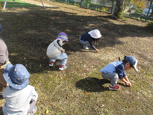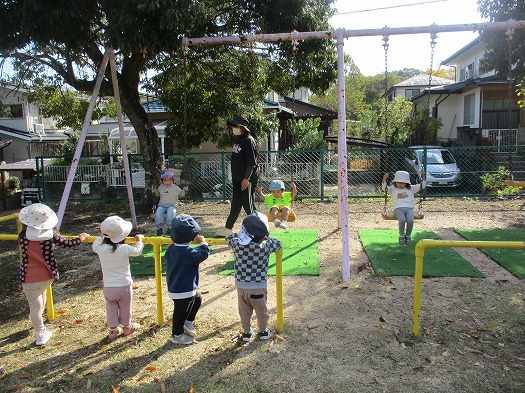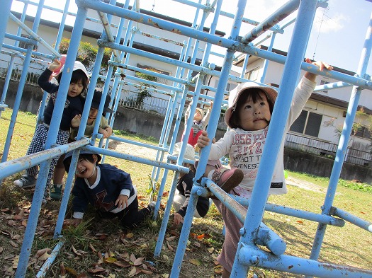 2023年11月07日 どんぐり公園 2歳児 にじ どんぐり公園に遊びに行きました。 今までは、下の原っぱで遊んでいたのですが、今日は上の遊具で遊びました。 出発進行~! ブランコ自分で乗れたよ! よし!登ってみよう! 高いすべり台、おもしろ~い! 「あ!どんぐり!!」 拾わずにはいられない… 天気もよく、気持ちの良いお散歩になりました♪ 一覧へ戻る