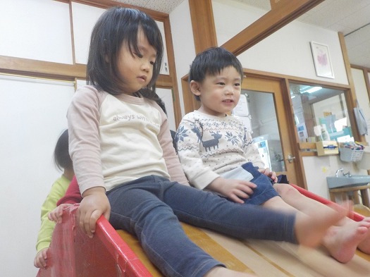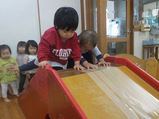 2023年11月10日 滑りたい!! 0歳児 はな 1歳児 ゆき すべり台を出して遊びました。 手で棒をしっかりとつかみ、足を置く場所を見ながら登り切ると、やりきった感でいっぱいで、いい笑顔でした! 滑る時も「きゃー」と楽しそうな声をたくさん聞声こえました。 「片付けるよ~」とすべり台を片付けることを伝えると、もう一度滑りたいと、長い列になりました。 面白かったね。またしようね♪ 一覧へ戻る